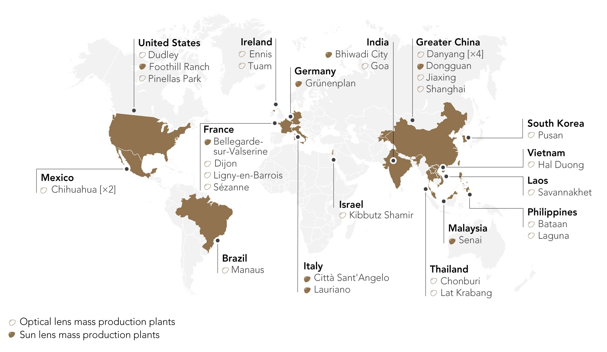 当社の工場では、完成品、準完成品、およびプラノ(度なし)のレンズを生産しています。さらに、度なしと度付きのサングラス用レンズの開発・製造に関しても専門知識を有しており、当社のサングラス事業において重要な役割を果たしています。設計やエンジニアリングから店舗への配送まで、レンズ事業のバリューチェーン全体を管理し、世界中の消費者に最高の視覚体験を提供することを目指しています。現在、当社は世界中で47の量産施設を運営しており、そのうち33は矯正レンズおよびプラノレンズの工場、14はアイウェアの工場です。