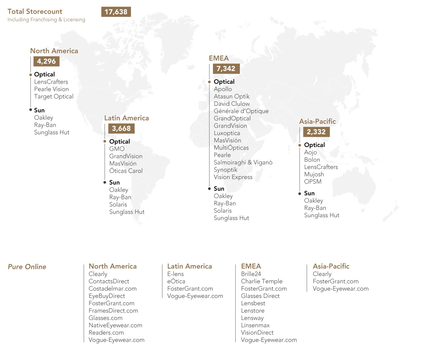 当社のロジスティクスは、すべての製品に対して卓越したサービスと流通網を提供するための能力と専門知識を支える重要な資産です。私たちは、レンズ、アイウェア、コンタクトレンズ、器具、機器、AFA(アパレル、フットウェア、アクセサリー)、マーケティングおよび広告素材、店舗専用什器を扱う118カ所の物流拠点を有するグローバルネットワークを運営しています。これらの拠点は製造拠点の近くに位置し、サプライヤー、生産工場、度付きレンズラボ、卸売顧客、小売店舗、Eコマース顧客間の物流フローを調整しています。